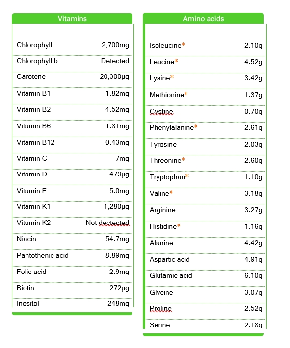 ที่มากไปกว่านั้น มันยังประกอบไปด้วยสารอาหารจำเป็นในปริมาณที่สูงกว่าปกติอีกด้วย CHLORELLA ประกอบไปด้วยโปรตีน 50 ถึง 60 % เมื่อเปรียบเทียบกับข้าว ที่มีเพียง 7 % และถั่วเหลือง 39 % CHOLORELLA ยังประกอบไปด้วยแร่ธาตุ ต่างๆ มากมายเช่น เหล็ก ไอโอดีน และ สังกะสี Chlorella เป็นอาหารที่ มีความสมดุลของสารอาหารจากธรรมชาติที่ ครบถ้วน จึงเป็นตัวเลือกที่ดีที่สุด ในการใช้รับประทานเป็นอาหารเพื่อสุขภาพ อย่างแท้จริง